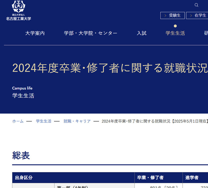 例:2024年度卒業・修了者に関する就職状況【2025年5月1日現在】|国立大学法人名古屋工業大学
